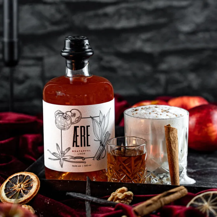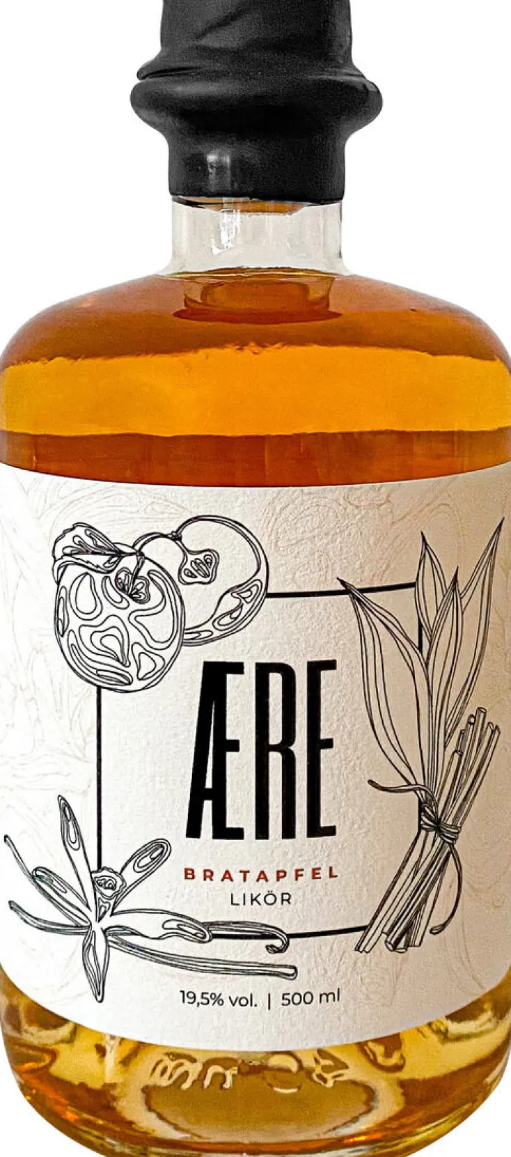 Der ÆRE Bratapfel ist ein Premium Likör auf ÆRE Korn-Basis. Die eigens hergestellten Bratäpfel entstehen aus geschmackvollen Äpfeln vom Obsthof Stehr aus dem Alten Land und werden mit allerhand köstlichen Gewürzen gold-braun gebacken. Die fertigen Bratäpfel dürfen dann mehrere Tage in hochkonzentriertem ÆRE Korn ziehen und ihre Aromen an das Feindestillat abgeben. Anschließend kommen noch bester, regionaler Apfelsaft vom Obsthof Matthies, Bourbon Vanille, Ceylon Zimt, Mandeln, Rosinen und einige geheime Gewürze in unsere Fässer, in denen der Ansatz dann mehrere Wochen zu unserem ÆRE Bratapfel Premium Likör reifen darf.