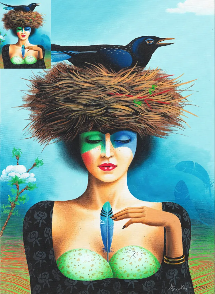 Der Künstler Michael Becker vereint Natur und Weiblichkeit. »Kunst mit Lust« – unter dieses Motto hat der Bremer Künstler Michael Becker seine Arbeit gestellt. Der Grafiker, Illustrator, Maler und Bildhauer kreiert phantastisch-surrealistische und figurative Symbiosen aus Mensch und Natur – wie auch in diesem Werk aus dem Jahre 2020 »Im Schutz der blauen Feder«. Deine Werke sollen Schönheit im klassischen Sinne ausdrücken. Dabei führen seine Motive immer wieder die Themen Mensch und Natur zusammen, zumeist in der Darstellung erotischer Frauengestalten, die mit der Schönheit der Natur nicht wetteifern, sondern ihr zutiefst symbiotisch verbunden sind.