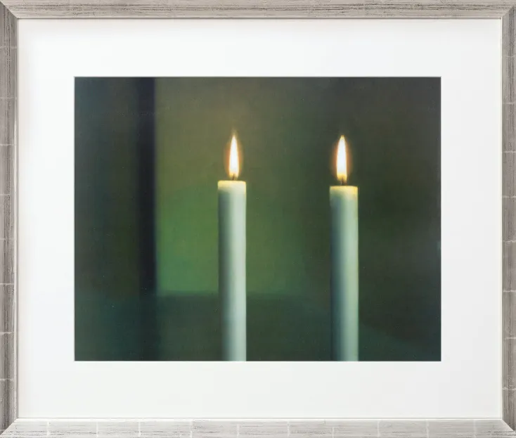 Die hochwertige Offsetlithografie »Zwei Kerzen« ist Teil einer Serie von Kerzenbildern, die Richter 1982 – 1983 schuf. Das Bild ist ein beeindruckendes Beispiel für fotografischen Realismus.