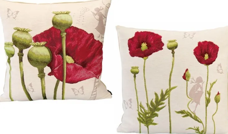 Zwei Kissenhüllen mit edlem Druck von naturgetreuen Mohnblüten. Wahlweise einzeln oder im Set erhältlich.