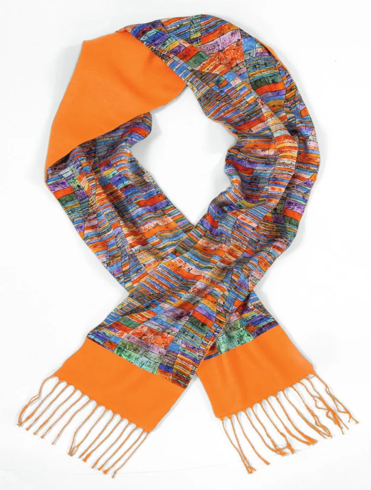 Nach Paul Klees Gemälde »Hauptweg und Nebenwege«. Dieser Schal mit seinen kräftigen Farben besteht auf der einen Seite aus 100% reiner Seide, auf der anderen Seite aus orangefarbener Pashmina-Wolle