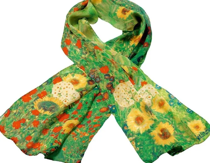 Am Attersee entstanden in den Jahren 1905 und 1906 Klimts weltberühmte Bauerngartenbilder, die diesem farbintensiven Seidenschal als Vorbild dienten.