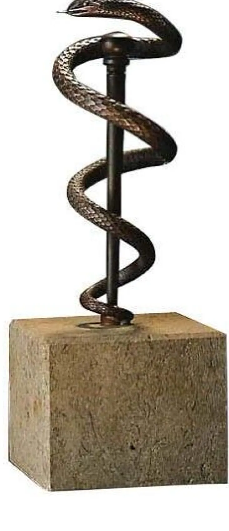 Das Standessymbol der Mediziner erinnert an die Verwandlung Asklepios, den die Ilias als „unvergleichlichen Arzt“ rühmt und der später seinen Vater Apollon beerbt und Gott der Heilkunst wird. Jeder kennt dieses Symbol, doch hier halten wir das Original in Händen: die Äskulapnatter, wie sie sich in Windungen den Stab emporwindet. Nach altem Vorbild aus Epidauros, um 350 v. Chr. Metallguss, Höhe mit Muschelkalksockel 23 cm.