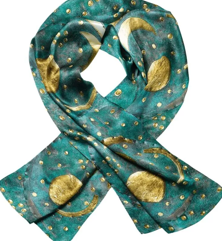 Was gibt es faszinierenderes als einen Sternenhimmel? Diesen edlen Schal aus 100%iger von Hand roulierter Seide ziert das Motiv der Himmelsscheibe von Nebra.