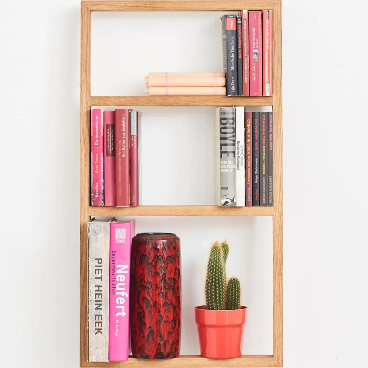 Zeitlos, individuell und in Handarbeit gefertigt. Das Regal »bertolt« lässt Bücher scheinbar schweben und setzt sie somit wirkungsvoll in Szene. Ob Kunstband, ZEIT-Edition oder Taschenbuch – das Regal eignet sich für alle Buchformate. Einzig der massive Holzrahmen scheint den Büchern ihren Halt zu geben. Ohne Bücher lüftet sich das Geheimnis: Eingelassene Edelstahlwinkel halten die Konstruktion an der Wand und lassen die Bücher schweben.