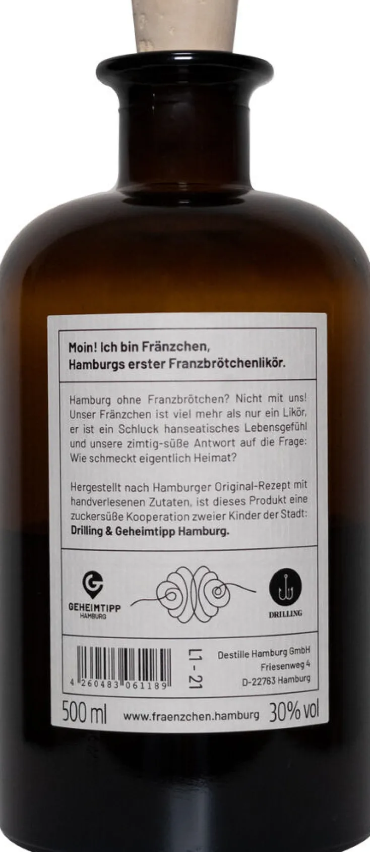 Entdecken Sie »Fränzchen« – den ersten Franzbrötchenlikör aus Hamburg! Dieser köstliche Likör bringt Ihnen ein zimtig-süßes Stück hanseatisches Lebensgefühl direkt ins Glas. Fränzchen wird nach einem Originalrezept hergestellt, das nur die besten Zutaten verwendet. In Hamburg sind Franzbrötchen mehr als nur ein Gebäck – sie sind ein Stück Heimat, ein Wahrzeichen der Stadt und ein Tor zur Welt. Dieser Likör ist eine Liebeserklärung an Hamburg.