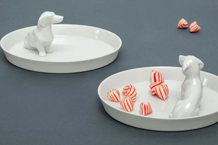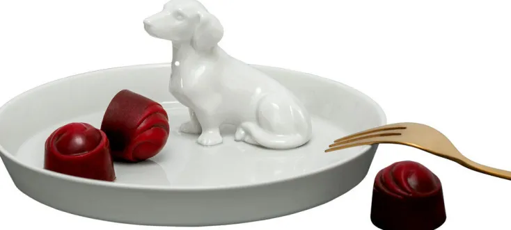 Diese hübsche Kombination aus der Porzellanmanufaktur feinesweißes eignet sich zum Servieren von feinen Törtchen, köstlichen Snacks oder zur Aufbewahrung von Schmuck. Der Dackel wird während des Brennvorgangs im Ofen fest mit dem Teller verschmolzen. Ein wunderbares Geschenk für alle Dackelfreunde und solche, die es dann werden. Verpackt ist der Teller in einer exquisiten Box, direkt zum Verschenken.