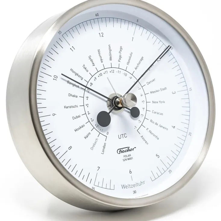 Die Genauigkeit des Messgerätes wird mit prägnanten Zeigern hervorgehoben. Der Minutenzeiger ist an seiner Spitze umgebogen und gewährleistet ein parallaxefreies und damit sehr genaues Ablesen. Die Typografie und Indizes des Ziffernblattes sind bei aller grafischen Feinheit sachlich und gut lesbar gehalten. Das Gehäuse der Weltzeituhr (Durchmesser 133 mm, Höhe 45 mm) besteht aus gebürstetem Messing bzw. gebürstetem Edelstahl. Es unterstreicht die Qualität dieser feinen Messtechnik und hebt mit der markanten Phase am Bodenteil die Position an der Wand mit besonderer Leichtigkeit hervor. Jedes einzelne Instrument ist mit einer Serien-Nummer versehen. Die » POLAR « Weltzeituhr wird wie alle Instrumente der Serie »POLAR« bei FISCHER in Deutschland handgefertigt. Erhältlich in den zwei edlen Ausführungen Messing und Edelstahl gebürstet.