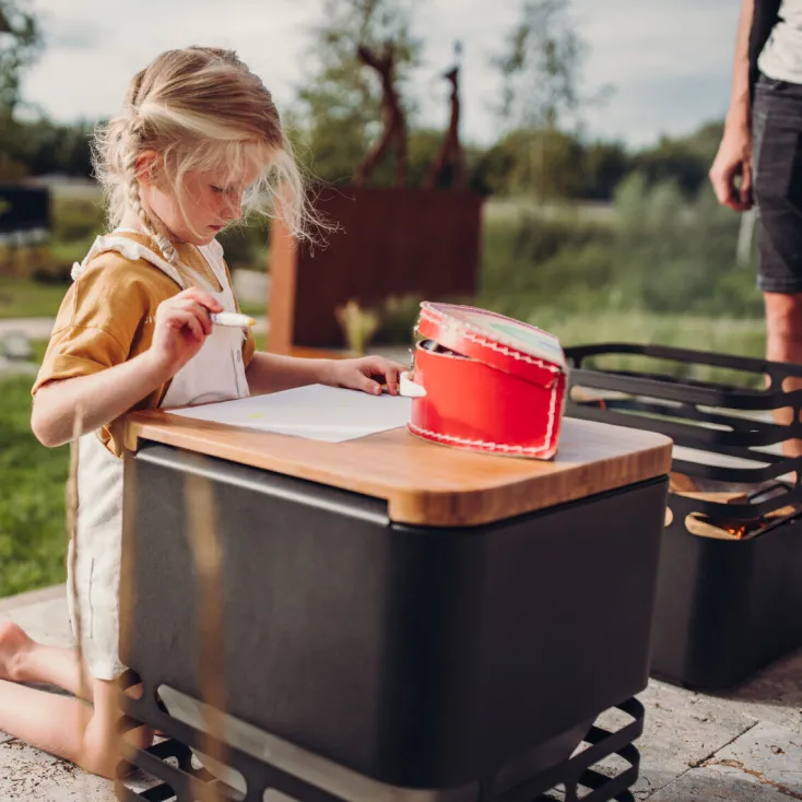 Das Auflagebrett verwandelt den Feuerkorb »CUBE« im Handumdrechen in eine angenehme Sitzmöglichkeit oder in einen Beistelltisch. Das Brett lässt sich einfach auflegen, nachdem der Feuerkorb umgedrecht wurde und abgekühlt ist. Das AUflagebrett kann ebenfalls als Servierbrett verwendet werden.