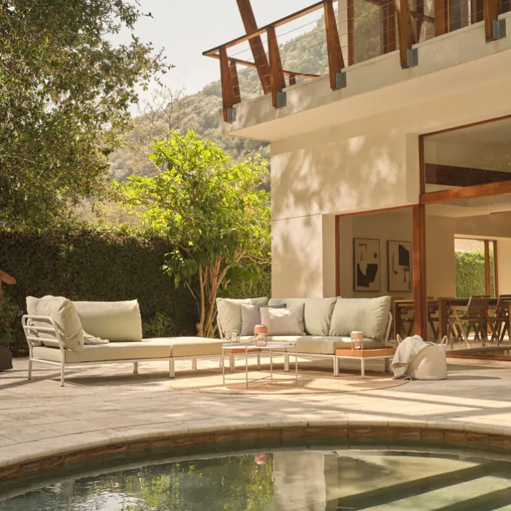 Das leichte Gestell und die weichen Kissen schaffen sowohl Kontrast als auch Komfort – und locken mit entspannter Lounge-Atmosphäre.