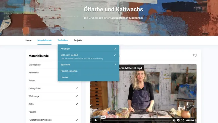 - 30 Videos zu allen Aspekten der Malerei mit Kaltwachs. Der Zugang zu der Kursplattform erfolgt über ein Passwort.