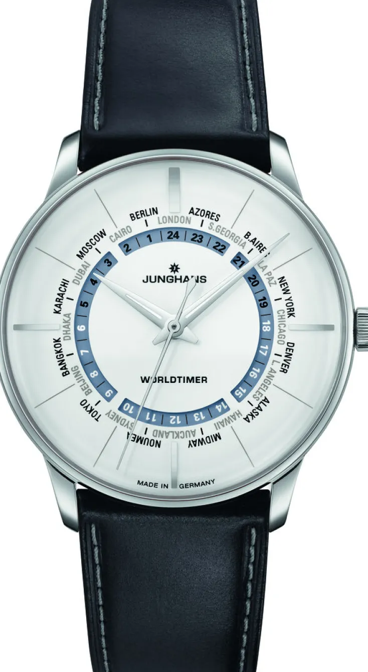 Eine ausgeprägte Liebe zum Detail sowie höchste Ansprüche an Design und Qualität prägen jedes einzelne Modell der 1861 gegründeten Uhrenmanufaktur Junghans aus dem Schwarzwald. Mit der »Meister Worldtimer« (Ø 40,4 mm) erscheint nun eine auf nur 50 Exemplare limitierte ZEIT-Sonderedition in exklusiver Farbgebung. Das matte, versilberte Zifferblatt wird harmonisch ergänzt vom Graublau der 24-Stundenscheibe, die die Zeit an 24 Orten der Welt gleichzeitig anzeigt. Die dauphinförmigen Zeiger sorgen nicht nur für optimale Ablesbarkeit, sondern auch für den nötigen Hauch Eleganz. Der fünffach verschraubte Mineralglasboden gewährt Einblick in das Automatikuhrwerk J820.5 mit 42 Stunden Gangreserve, das in der Praxis durch größte Verlässlichkeit und Langlebigkeit überzeugt. Ganz gleich ob im Businesskontext oder im Alltag: Die »Meister Worldtimer« spiegelt uns gekonnt, dass unsere Welt in Zeitzonen unterteilt sein mag, wir aber alle im selben Moment leben.