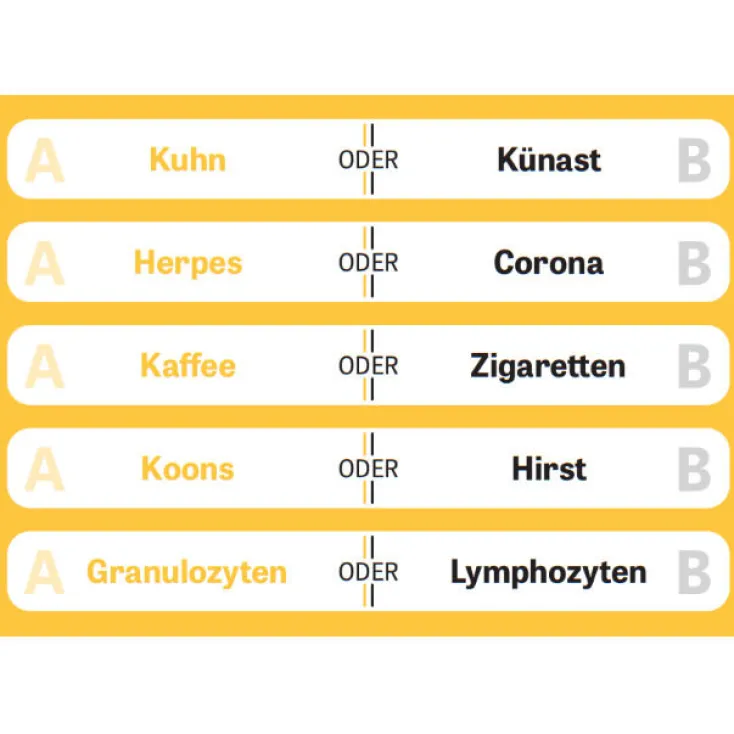 Endlich ist Teil 2 des beliebten A-oder-B-Spiels aus dem erfolgreichen ZEIT-Podcast »Alles gesagt?« da. Dieses schnelle Kartenspiel bietet über 600 neue, überraschende Alternativen, zwischen denen sich die Spielerinnen und Spieler entscheiden müssen. Dank verschiedener Spielvarianten können die Fragen sowohl zu zweit als auch in einer größeren Gruppe beantwortet werden. Gelingt es den Spielerinnen und Spielern, sich gegenseitig richtig einzuschätzen, oder deckt das Spiel ganz neue Seiten an den Mitspielern auf? Sind sie sich einig oder gibt es Diskussionsbedarf? A oder B?