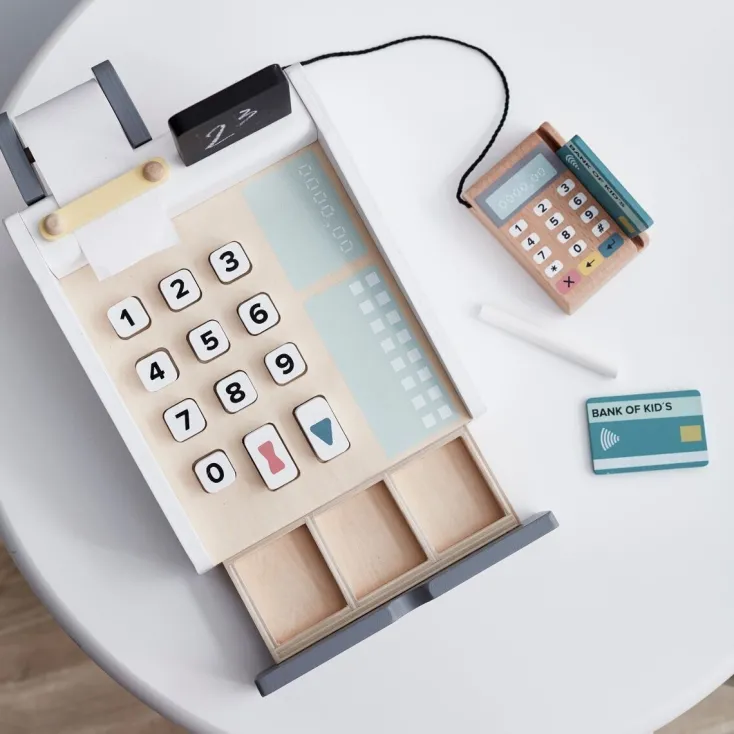 Diese Kasse im modernen Design gehört in jeden Kaufladen. Sie lässt sich öffnen, um Münzen und Scheine zu verstauen – selbstverständlich können die kleinen Kunden aber auch mit der Karte bezahlen. Karte durch das Gerät gezogen, Code eingegeben, schon ist die Ware bezahlt. Außerdem bietet die kleine Tafel an der Kasse die Möglichkeit, mit Kreide selber Zwischensummen zu notieren. Durch die mitgelieferte Bonrolle erhält der Kunde am Schluss sogar eine handgeschriebene Quittung für seinen Einkauf.