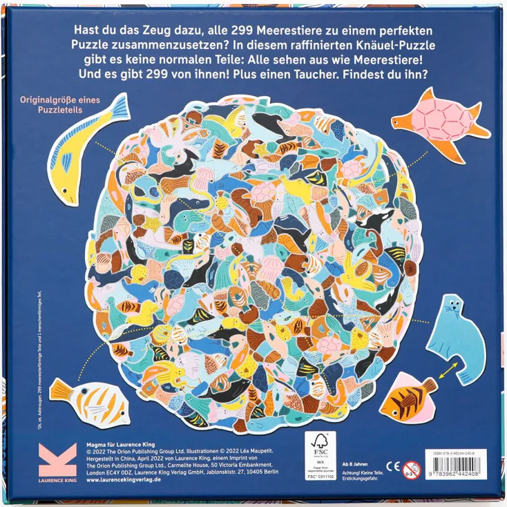 Wer hat das Zeug dazu, alle 299 Meerestiere zu einem perfekten Puzzle zusammenzusetzen? In diesem raffinierten Knäuel-Puzzle gibt es keine gewöhnlichen Puzzle-Teile: Jedes ist einzigartig und sieht aus wie ein Meersbewohner! Und es gibt 299 von ihnen! Plus einen Taucher. Wer findet ihn als Erste*r? Damit niemand verzweifelt, gibt es sowohl ein Poster als Vorlage als auch einen praktischen Rahmen, um alle Meerestiere in Schach zu halten.