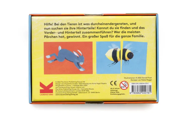 Hilfe! Bei den Tieren ist was durcheinandergeraten, und nun suchen sie ihre Popos! Wer kann sie finden und ihre Vorder- und Hinterteile zusammenführen? Aber aufgepasst! Ein Okapi sieht vorne anders aus als hinten… Wer die meisten Pärchen findet, gewinnt. Ein großer Spaß für die ganze Familie!