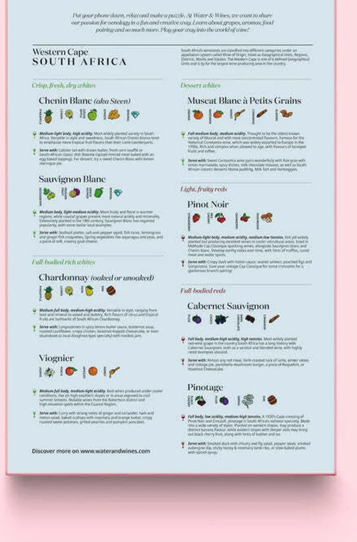 Sorgfältig ausgewählt von Die Puzzlebox mit Traubenprofilen und vielen Tipps zur Kombination mit Speisen ermöglicht es Ihnen, die Aromen und Eigenschaften der lokalen Rebsorten zu erkunden. Lernen Sie beim Zusammensetzen des Puzzles mehr über die einzelnen Regionen und Bezirke und gewinnen Sie ein tieferes Verständnis für die reiche Weinkultur Südafrikas.