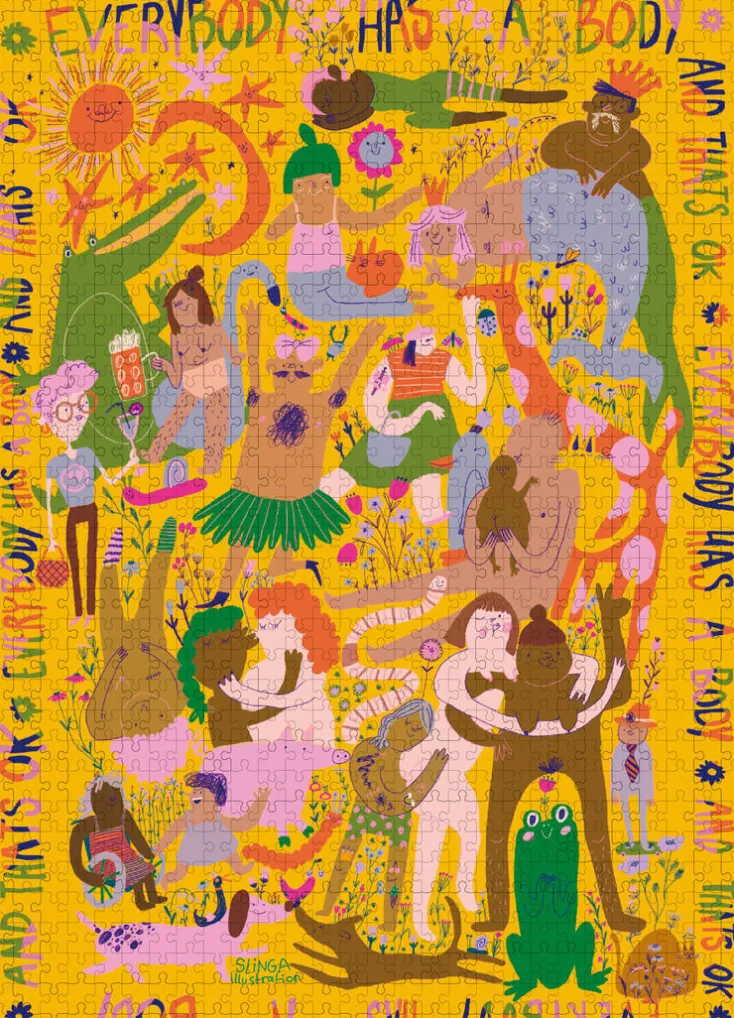 Achtung! Dieses Puzzle setzt das Liebeshormon Oxytocin frei — denn in diesem Getümmel wird geknutscht, gekuschelt und geherzt so weit das Auge reicht. Hier gibt es allerhand freudige Menschen und Tiere zu entdecken und dabei die unterschiedlichsten Körper, denn, na klar: Everybody has a body and that’s ok. Also puzzelt euch easy-peasy durch all die süßen Bodies, das wird ein herrlicher Spaß!