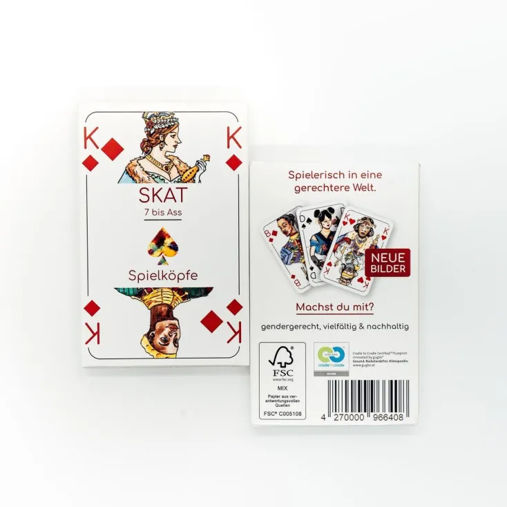 Gendergerechte, vielfältige und nachhaltige Spielkarten. Es gibt Königinnen und Könige und alle Figuren sehen unterschiedlich aus. Z.B. gibt es Damen mit kurzen Haaren oder einen blinden König, außerdem Menschen mit unterschiedlichen Hautfarben und Religionen. Die Symbole und Zahlenkarten bleiben gleich, sodass man mit den Karten spielen kann wie mit allen anderen Karten auch.
