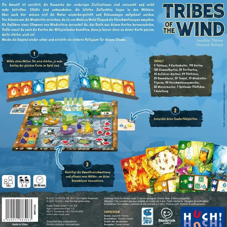 5 Tableaus, 5 Kartenbänke, 110 Karten (80 Elementkarten, 30 Wertungskarten, 20 Anführerkarten), 44 Plättchen, 25 Baumhäuser, 20 Tempel, 35 Windreiter-Figuren, 90 Verschmutzungsmarker, 76 Wassermarker, 6 Vervielfältigungsmarker, 1 Spielende-Plättchen, 9 Beutel, 1 Anleitung