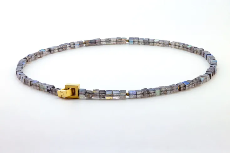Labradorit Würfelkette durchsetzt mit mattierten goldplattierten Silberkugeln und ebenfalls goldplattierten Silberschließe. Labradorit ist ein Mineral, das mitunter in metamorphen Gesteinen gebildet wird; weit häufiger jedoch kristallisiert Labradorit aus silikatreichen Schmelzen bzw. niedrig temperierten Restschmelzen als Mineral magmatischen Ursprungs aus. Die Patentschließe aus dem Hause Menard setzt einen unverwechselbaren Akzent und formvollendet das Collier.