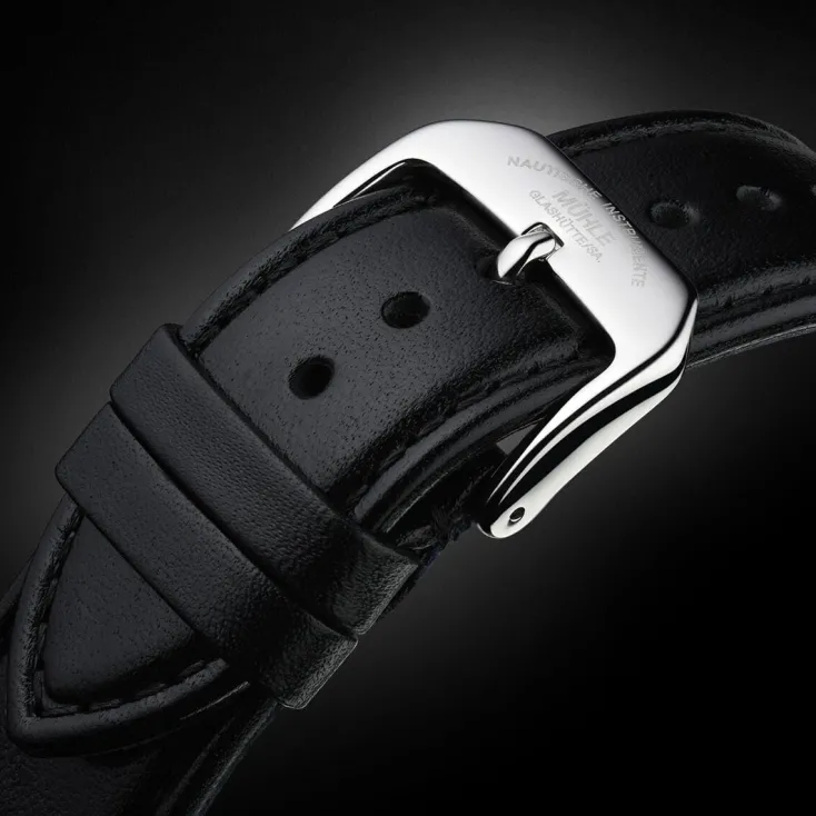 Für ein perfektes Äußeres sorgt auch das hochwertige Edelstahl-Gehäuse. Unterhalb der kannelierten Lünette offenbart es die typischen Merkmale der Teutonia-Familie. So wird der Gehäuse-Mittelteil mit dem charakteristischen senkrechten Schliff versehen, der von Hand aufgebracht wird. Die Oberseiten der volutenförmigen Hörner werden dagegen fein poliert und erzeugen eine abwechslungsreiche Spannung zwischen mattierten und polierten Oberflächen und der kannelierten Lünette. Wie bei Mühle-Glashütte üblich wird das hochwertige, bis 10 bar wasserdichte Gehäuse und einem kratzfesten, entspiegelten Saphirglas versehen, das jederzeit den ungetrübten Blick auf das edle Zifferblatt ermöglicht. Das Uhrwerk kann wiederum durch den Sichtboden aus Saphirglas bewundert werden. Das Automatikwerk wird mit der 2003 von Mühle entwickelten, patentierten Spechthals-Regulierung ausgestattet. Diese sorgt dafür, dass sich die Reglage des in sechs Lagen regulierten Uhrwerks auch dann nicht verändert, wenn die Uhr einmal einen stärkeren Stoß verkraften muss.