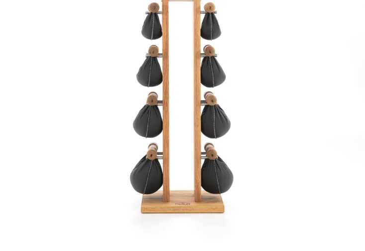 Alle Swing Hanteln werden von Hand genäht und sind mit einem Eisengranulat befüllt, welches die Unwucht in der Bewegung unterstützt, da es sich im Ledersack verlagern kann. Nach dem Workout können Sie Ihre acht Swing Hanteln aus handgenähtem Echtleder am Swing Turm platzsparend und optisch ansprechend verstauen.