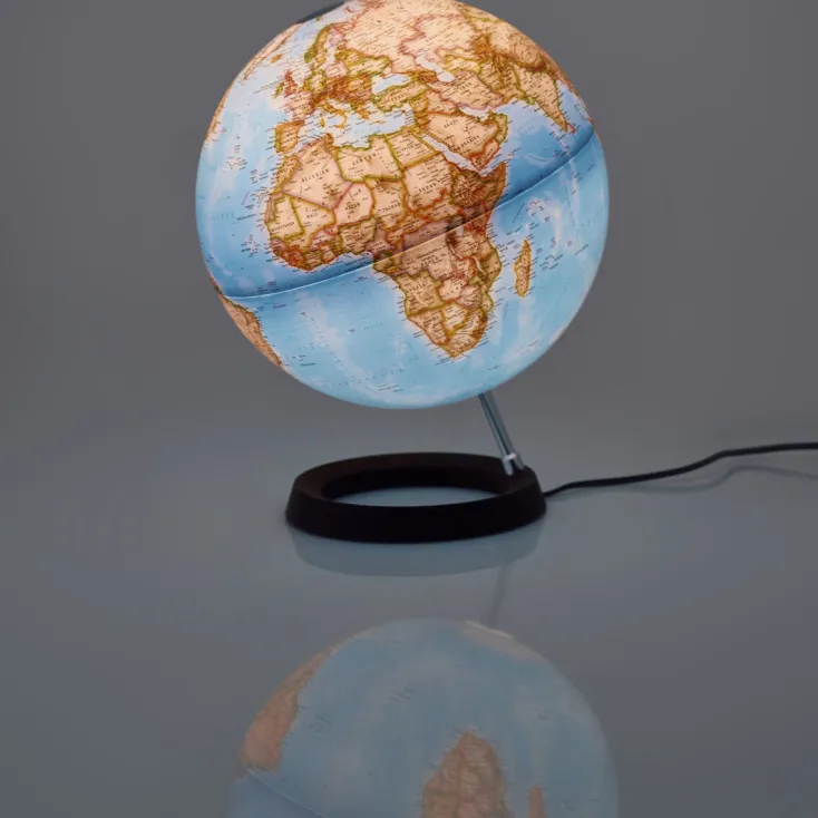 Entdecken Sie diesen einzigartigen Leuchtglobus mit über 2.000 verzeichneten geografischen Namen – eine meisterhafte Kombination aus klassischem Antikdesign und aktueller, politischer Kartografie von National Geographic. Jedes Land ist in einer individuellen Farbgebung dargestellt, mit dunklen Grenzlinien für eine klare Übersicht und verstärkten Kontrasten der politischen Gliederung. Die warmen Erdfarbtöne und die klare Schriftgestaltung sorgen für eine hervorragende Lesbarkeit. Feinste Schattierungen zeigen zudem Gebirgsketten und das unterseeische Relief, wodurch die geografischen Besonderheiten besonders plastisch hervortreten.