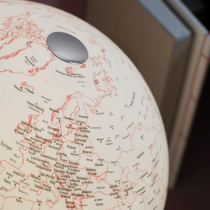 Weißer edler Tischglobus mit schwarzer Beschriftung und roten Grenzlinien vom rennomierten Hersteller Räthgloben.