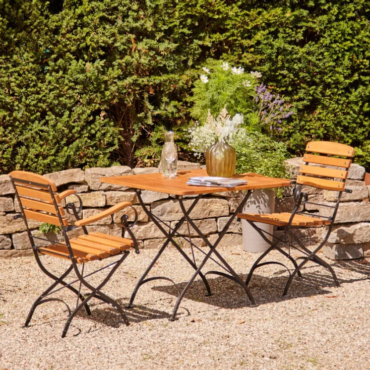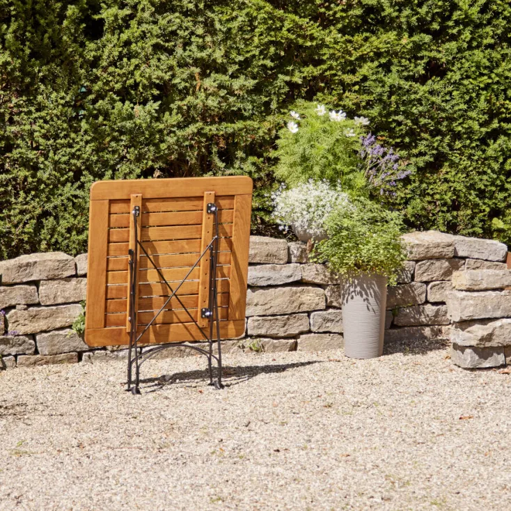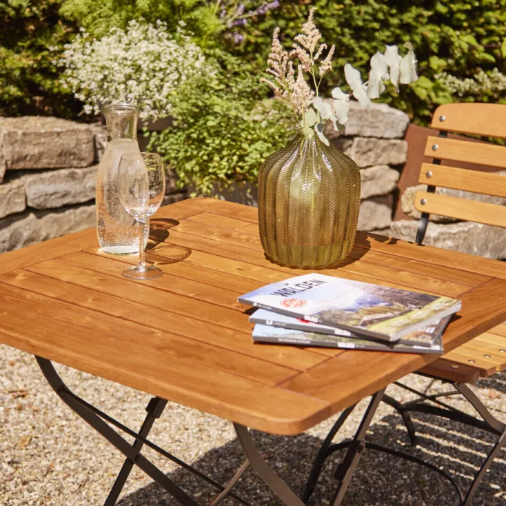 Der Gartentisch lässt sich einfach zusammenklappen und platzsparend verstauen. Somit ist der Tisch auch ideal für kleine Gärten und Balkone geeignet. Mit seinem robusten Stahlgestell bietet »Peru« anhaltende Stabilität und Beständigkeit gegenüber den Elementen.