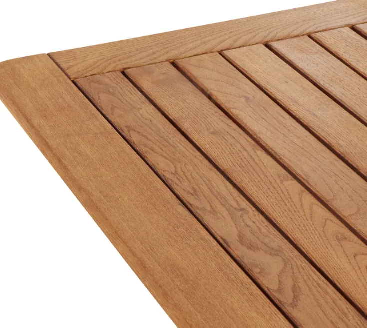 Die Tischplatte besteht aus FSC®-zertifiziertem Robinienholz. Diese Holzart wächst in Europa und ist besonders hart und robust. Zudem besticht sie mit ihrem warmen Farbton.