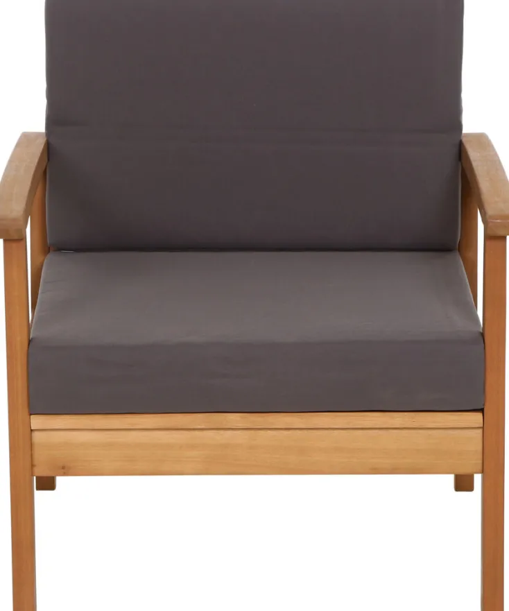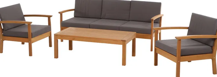 Genießen Sie entspannte Stunden im Freien mit dem 4-teiligen Tavira Lounge Set von Sienagarden. Dieses exklusive Loungeset besteht aus zwei Sesseln, einem 3er Sofa und Lounge Tisch bietet Platz für bis zu 5 Personen. Gefertigt aus hochwertigem Eukalyptusholz erhält es durch eine spezielle Lasur die edle Teakoptik. Das FSC-zertifizierte Holz ist äußerst pflegeleicht und beständig gegen Witterungseinflüsse. Zudem harmonieren die warmen Farben des Holzes perfekt mit den grauen Sitz- und Rückenkissen aus langlebigem Polyester. Die Kissen sind speziell für Holzmöbel geeignet und bieten einen großzügigen Sitzkomfort.