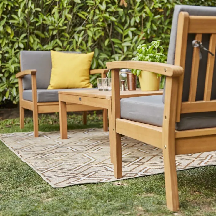 Der passende Tisch bietet mit seinen Maßen von 60 x 120 cm ausreichend Platz für Getränke, Snacks und stimmungsvoller Dekoration. Verwandeln Sie Ihren Garten in eine Wohlfühloase und schaffen Sie mit dem Tavira Lounge Set Ihren eigenen Entspannungsort im Freien!