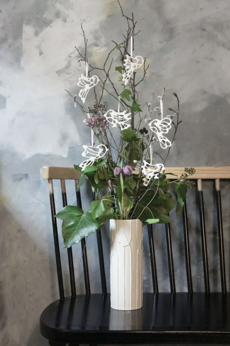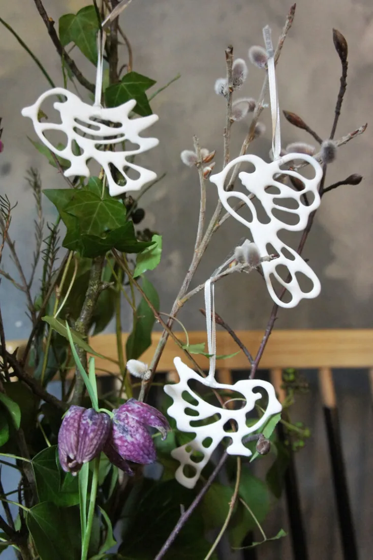 Die Leichtigkeit des zeitlosen Anhängers kombiniert mit dem zart verarbeiteten Material verleiht den »schmückenden Porzellanvögeln« von Silke Decker eine wertvolle Erscheinung. Jedes Exemplar ist ein handgefertigtes Unikat, weshalb kein Anhänger dem anderen gleicht und diese dadurch zu etwas ganz besonderem werden.