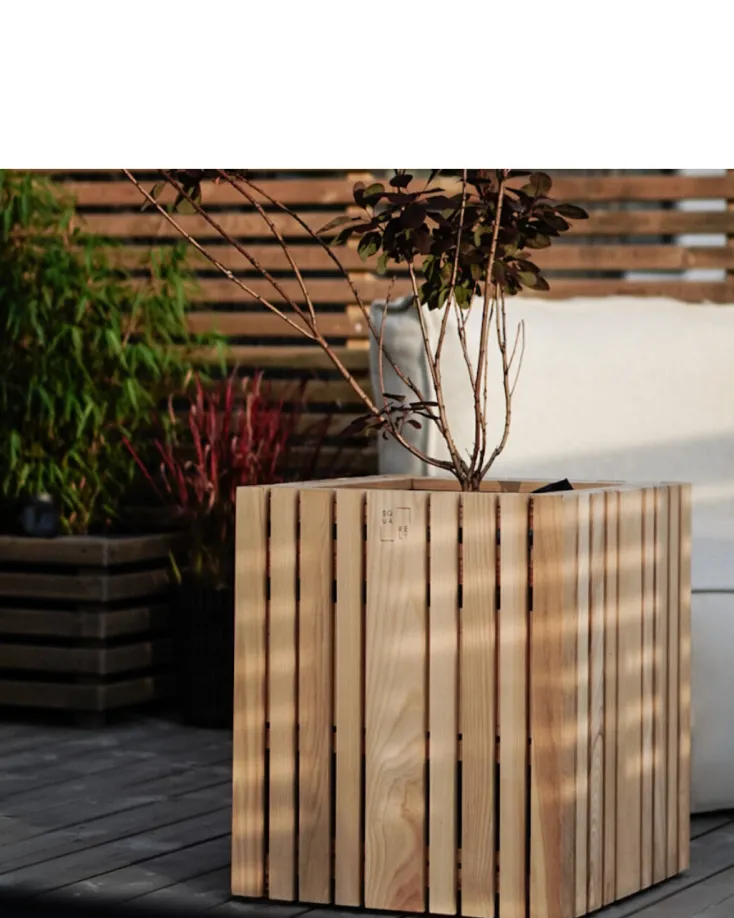 Gestalten Sie Ihren Raum oder Garten mit »GrowBIG«, einem kubischen handgefertigten Pflanzgefäß aus edlem Eichenholz mit schlichten, vertikalen Planken. Bringen Sie echte Waldstimmung in Ihren Innen- oder Außenraum.