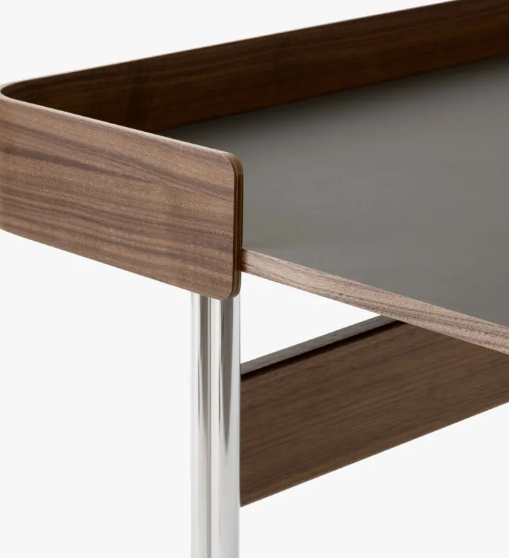 Der Pavilion-Schreibtisch erfüllt alle Anforderungen der Heimarbeit und ist in zwei eleganten Varianten erhältlich: »Mushroom Linoleum, Eiche, Chrom« und »Iron Linoleum, Walnuss Holz & Chrom«. Jede Ausführung bietet eine stilvolle Kombination aus hochwertigen Materialien und exzellenter Verarbeitung.