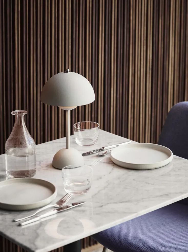 Die Flowerpot Akku-Tischleuchte VP9 von &tradition ist eine gefärbte Leuchte mit einem runden Sockel und einem runden Schirm. Sie verkörpert die experimentelle Haltung von Designer Verner Panton. Leicht, kompakt und vor allem mit einem wiederaufladbaren Akku ausgestattet, ist die tragbare VP9 die perfekte Lichtquelle für gemütliche Abende – ob im Wohnzimmer oder auf der Terrasse.