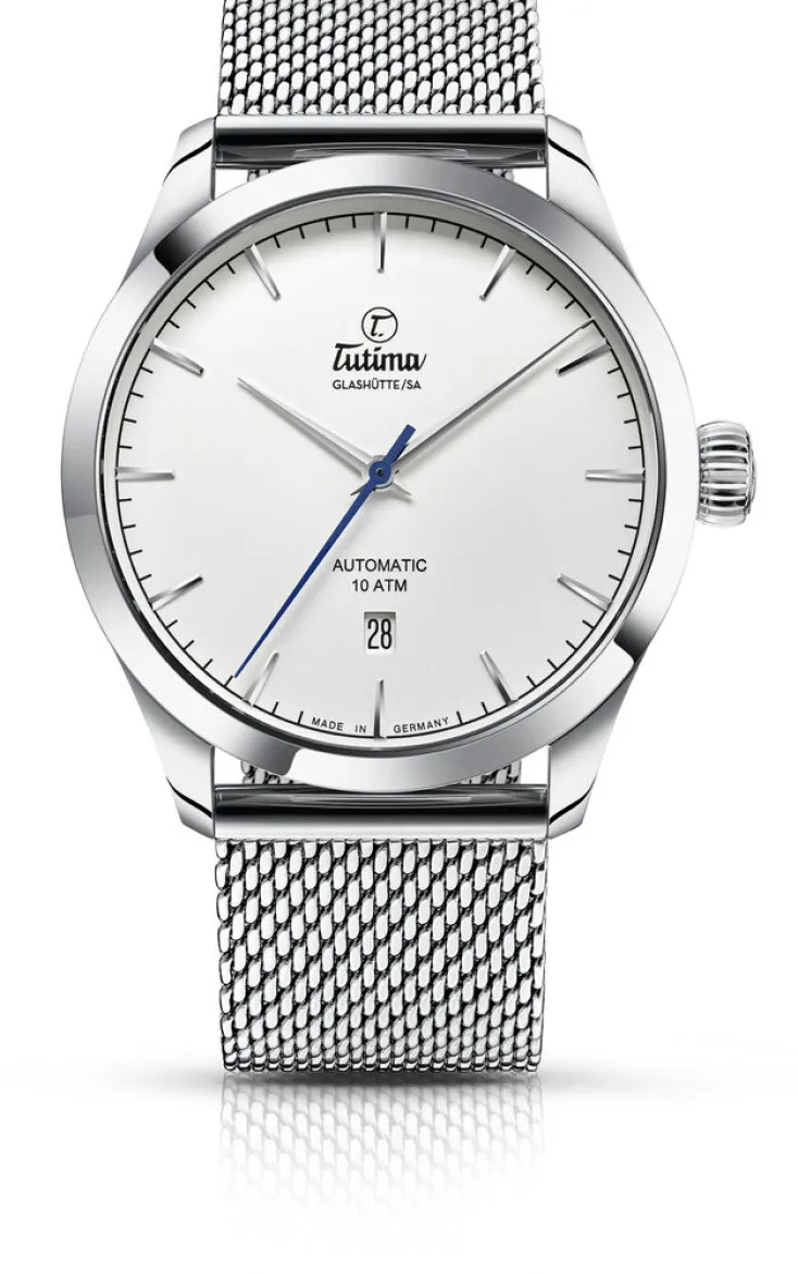 Exklusiv für die ZEIT präsentiert Tutima Glashütte die puristisch-reduzierte Automatikuhr »Flieger Aero Club«. Die auf nur 100 Exemplare limitierte Sonderedition ist eine moderne Reminiszenz an die historischen Pilotenuhren von Tutima Glashütte, die Maßstäbe im Bereich der Fliegerei setzten. Im Namen des Modells drückt sich zudem die Verbundenheit mit dem Deutschen Aero Club aus, den die Glashütter Marke seit vielen Jahren als Hauptsponsor unterstützt. Blickfang der ZEIT-Sonderedition ist der markante Sekundenzeiger in Blau, der sich kontrastvoll vom weißen Zifferblatt abhebt. Die schlanken Edelstahlzeiger weisen den gleichen Fasenschliff auf wie die Indexe, was das harmonische Gesamtbild des Blatts verstärkt.