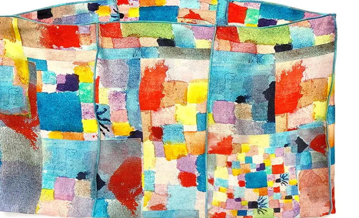 Der leichte Rundschal in frischen Pastelltönen ist aus hochwertigem Seidensatin gefertig und nach abstrakten Motiven des Aquarells „Südliche Gärten“ vom Künstler Paul Klee bedruckt. Durch das helle und einzigartige Design des Schals eignet er sich bestens als Geschenk für begeisterte Kunst- und Modefans und passt perfekt zu sonnigen Frühlings- oder Sommertagen.