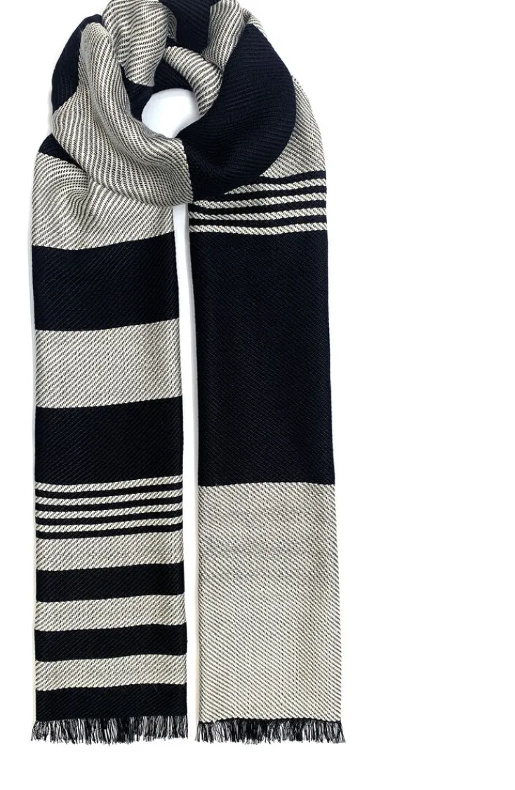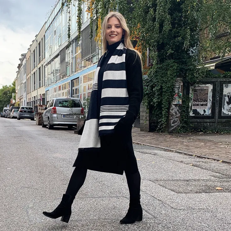 Der handgefertigte Seidenschal in schwarz und weiß ist mit seiner schlichten Eleganz ein wahres Lieblingsteil. Das Gewebe aus reiner Seide ist weich und anschmiegsam und bietet im Herbst, Winter und Frühling einen zuverlässigen Kälteschutz. Die asymmetrisch angeordneten Streifen, mit leicht sportlicher Note, und die klassische Farbkombination machen den Schal zu einem besonderen Blickfang, der sowohl zu kräftigen, als auch auch zu zarten Tönen passt. Jeder Schal wird einzeln auf einem hölzernen Webstuhl in Körperbindung handgewebt, was jedes Stück einzigartig macht.