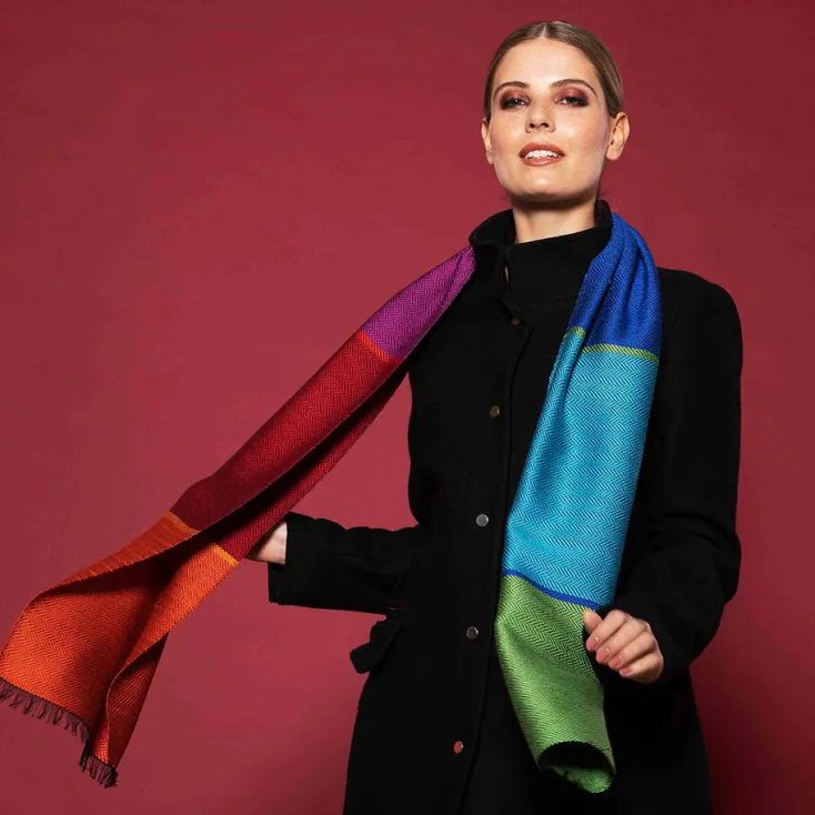 Dieser bunte Seidenschal ist ein Accessoire wie kein anderes. Mit seinen leuchtenden Farben und seinem feinen Fischgratmuster ist er ein besonderer Blickfang, der gleichzeitig wohlig warm hält und sich zu sämtlichen Jacken und Mänteln in Ihrem Schrank wunderbar kombinieren lässt. Egal, was Sie vorhaben, dieser modische Seidenschal ist ein idealer Begleiter für jeden Anlass.