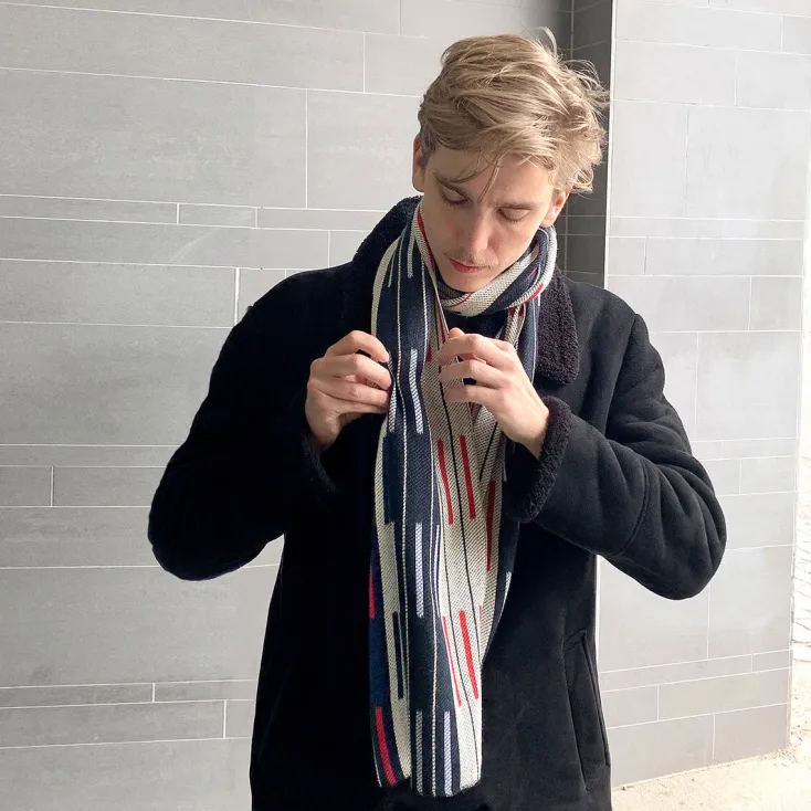 Entdecken Sie den Seidenschal in Natur und Schwarz mit roten grafischen Elementen – ein außergewöhnliches Accessoire, inspiriert von den Farben und dem Design des Bauhauses. Die schlichte Eleganz der reduzierten Musterung macht ihn zu einem vielseitigen Begleiter, der jedes Outfit bereichert und garantiert alle Blicke auf sich zieht. Dieser einzigartige Doublé-Schal wird in limitierter Auflage aufwendig am Handwebstuhl gefertigt, wodurch er seine unvergleichliche Ausstrahlung erhält. Sein Design ist eine Hommage an die beeindruckenden Webarbeiten der Textilkünstlerin und Bauhaus-Weberin Anni Albers.