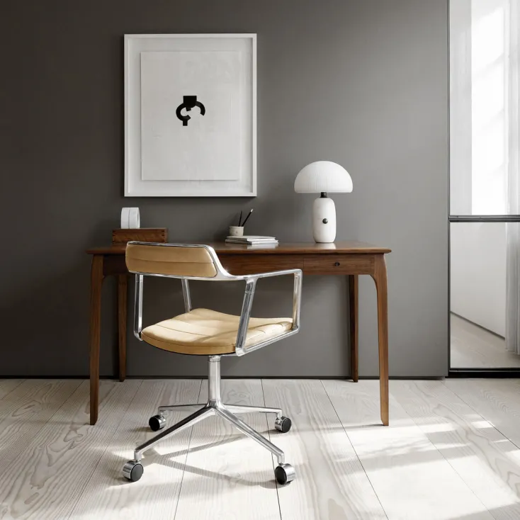 Der Vipp Drehstuhl »Swivel« eignet sich perfekt für Ihr Home Office oder den Besprechungsraum. Der Stuhl verfügt über einen polierten oder pulverbeschichteten Aluminiumrahmen mit gepolstertem Ledersitz und bequemer Rückenlehne. Eine vierbeinige Basis auf Lenkrollen ermöglicht eine 360°-Drehung des Sitzes und bietet Ihnen somit den ganzen Tag ein flexibles Sitzerlebnis. Die Polsterung aus sandfarbenem Leder weist einzigartige optische Merkmale auf.