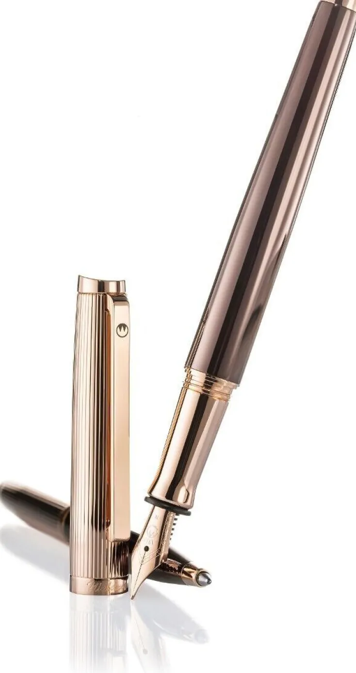 Der Kugelschreiber der Serie »Tuscany« aus der Manufaktur Waldmann ist aus massivem Sterling-Silber gefertigt und mit mehrschichtigem schwarzem Brilliantlack verziert. Die Kappe wird geziert von einem edlen Linien-Design. Mit 24K Roségold plattierte Zierteile machen den Stift zu etwas ganz Besonderem und verleihen ihm eine einzigartige Eleganz.