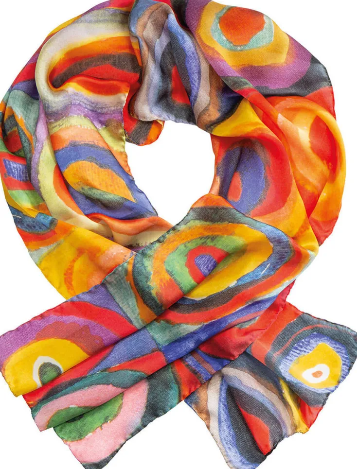 Der Schal besteht aus reinem Seidensatin. Die leuchtenden Farben sind zeitlos und schön und bilden ein Kandinsky-Motiv von 1913 ab. Das Original von Wassily Kandinsky hängt heute in der Städtischen Galerie im Lenbachhaus, München.