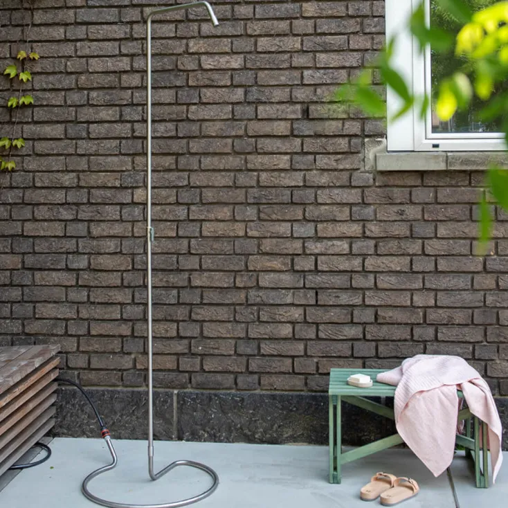 Die Gartendusche »Serpentine« ist komplett aus rostfreiem Edelstahl gefertigt. Der Duschkopf hat ein einzigartiges Design. Auch wenn er von außen wie ein einfaches und geradliniges Rohr aussieht, ist der Wasserstrahl im Inneren in kleinere Röhren umgestaltet. Der Duschkopf verteilt den Strahl zu einem breiten und komfortablen Duschstrahl, genau wie bei einer normalen Dusche.