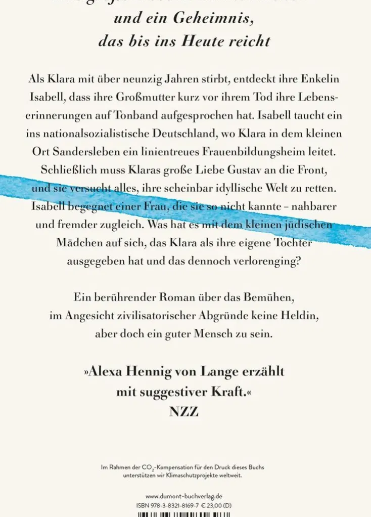 Als Klara mit über neunzig Jahren stirbt, entdeckt ihre Enkelin Isabell in ihrem Haus einen Karton mit Tonbandkassetten, auf die ihre Großmutter kurz vor ihrem Tod ihre Lebenserinnerungen aufgesprochen hat. Isabell taucht in den Aufnahmen ein ins nationalsozialistische Deutschland, wo Klara in dem kleinen Ort Sandersleben ein linientreues Frauenbildungsheim leitet. Als der Krieg ausbricht und Gustav, ihre große Liebe, an die Front zieht, droht ihre scheinbar idyllische Welt zu zerbrechen. Isabell begegnet einer Frau, die, zerrissen zwischen Anpassung und Abneigung gegen das Regime, versucht, einen Weg durch das Dritte Reich zu finden – und ihr dadurch nahbarer und zugleich fremder erscheint. Was hat es mit dem kleinen jüdischen Mädchen auf sich, das Klara als ihre eigene Tochter ausgegeben hat und das dennoch verlorenging? >Zwischen den Sommern< ist nach >Die karierten Mädchen< der zweite Band der >Heimkehr-Trilogie<, die vom Ende der Zwanziger bis in die Sechzigerjahre reicht. Sie ist inspiriert von den Erinnerungen von Alexa Hennig von Langes Großmutter, die diese im hohen Alter auf mehr als einhundertdreißig Tonbandkassetten aufgenommen hat.