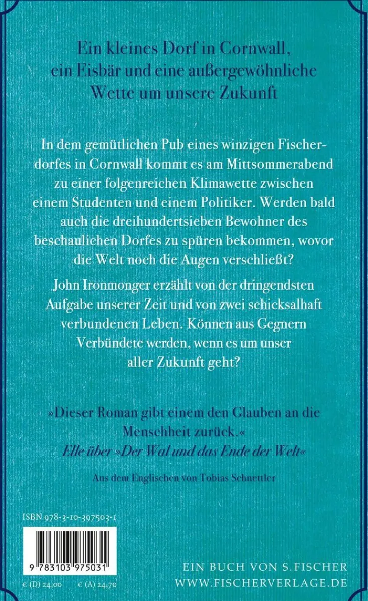 In dem gemütlichen Pub eines winzigen Fischerdorfes in Cornwall kommt es am Mittsommerabend zu einer folgenreichen Zukunftswette zwischen einem Studenten und einem Politiker. Werden bald auch die 307 Bewohner des Dorfes zu spüren bekommen, wovor die Welt noch die Augen verschließt? Wird das Haus des Politikers in 50 Jahren vom Meer verschlungen werden? John Ironmonger erzählt von der dringendsten Aufgabe unserer Zeit, von einer Reise in die Arktis, von zwei schicksalhaft verbundenen Leben und nicht zuletzt von der großen Frage: Können aus Gegnern Verbündete werden, wenn es um unser aller Zukunft geht?