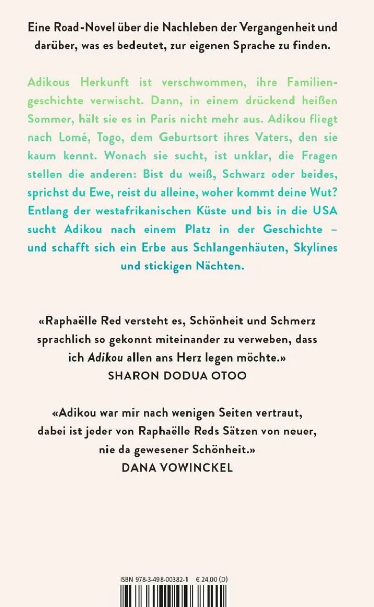 Eine Road-Novel über die Phantome der Vergangenheit, über Scham und über Wut und darüber, was es bedeutet, bei sich zu sein. Adikous Herkunft ist verschwommen, die Spuren ihrer Familiengeschichte sind verwischt, sie weiß nicht einmal, wie man ihren Namen richtig ausspricht. Dann, in einem drückend heißen Sommer, hält sie es in Paris nicht mehr aus. Adikou fliegt nach Lomé, Togo, dem Herkunftsort ihres Vaters, den sie nicht kennt. Wonach sie sucht, ist ihr nicht klar, die Fragen stellen die anderen, bei der Passkontrolle, in den Loméer Imbissen, den Unterkünften, dauernd: Wer ist dein Vater, bist du weiß oder schwarz oder beides, wie fühlt es sich an, als Frau alleine zu reisen, sprichst du Éwé, bist du Journalistin, was suchst du hier? Von Togo aus reist Adikou entlang der westafrikanischen Küste bis in die USA. Sie schafft sich ein Erbe aus Schlangenhäuten, Skylines und stickigen Nächten, erforscht Geschichte und Geschichten, Vergangenheit und Gegenwart – bis sie den Worten des verschwundenen Vaters lauschen kann.