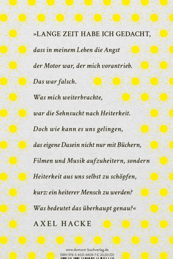 »Ernst ist das Leben, heiter ist die Kunst«, wusste schon Friedrich Schiller. Doch was ist Heiterkeit eigentlich? Und wie bekommen wir sie in unser ernstes Leben zurück? In Zeiten, in denen uns intuitiv erst einmal anders zumute ist, macht sich Bestsellerautor Axel Hacke auf die Suche nach einem fast vergessenen Gemütszustand. Und stellt bald fest, dass Heiterkeit viel mehr ist als das. Unterhaltsam, klug und persönlich erklärt er, warum Heiterkeit eine Lebensphilosophie ist, was sie vom Witz unterscheidet, und warum sie manchmal auch Arbeit macht. Denn »ein heiterer Mensch zu sein, bedeutet nicht, das Schwere zu ignorieren, sondern es in etwas Leichtes zu verwandeln.« Wie das gelingt, verrät er uns in diesem heiteren Buch.